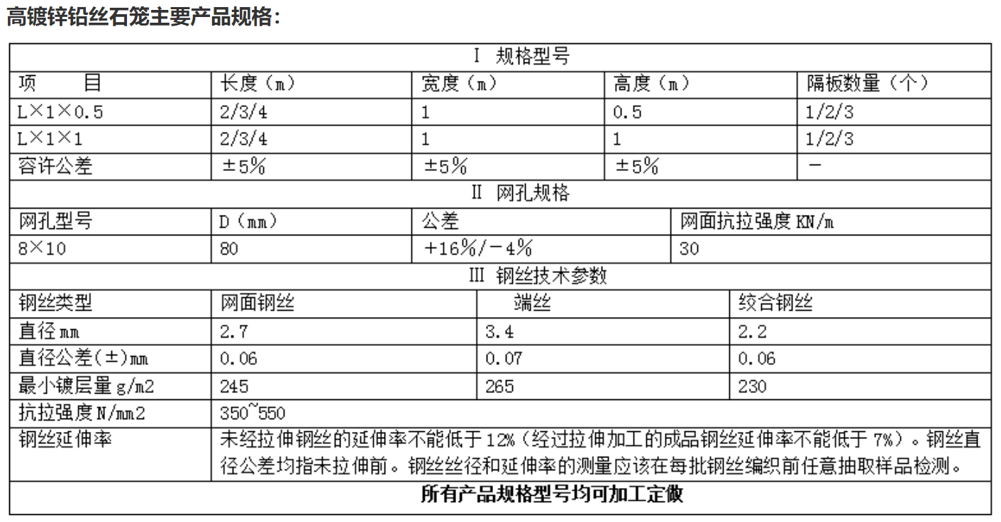 河道铅丝石笼是一种生态格网结构。河道铅丝石笼由高抗腐蚀、高强度、具有延展性的低碳钢丝或者包覆PVC的以上钢丝使用机械编织而成,使用该网制作而成的箱型结构就是石笼网箱。根据EN10223-3和YB/T4190-2018标准,所使用的低碳钢丝直径根据工程设计要求而不同。一般介于2.0-4.0mm之间,钢丝的抗拉强度不少于35kg/㎡,金属镀层重量一般高于245g/㎡石笼网片的边缘线直径一般要大于网线直径。