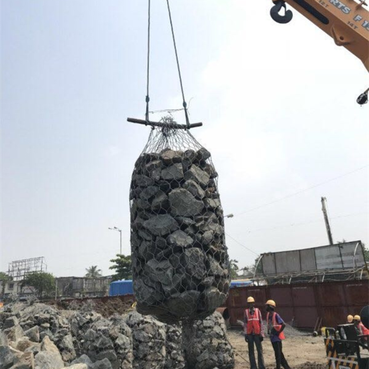 绑好后,用机器小心将石笼网兜一个一个或两个两个的吊放到恰当位置。为了保证质量,石笼网兜缝边、组装时应用较粗的边丝和绑丝。